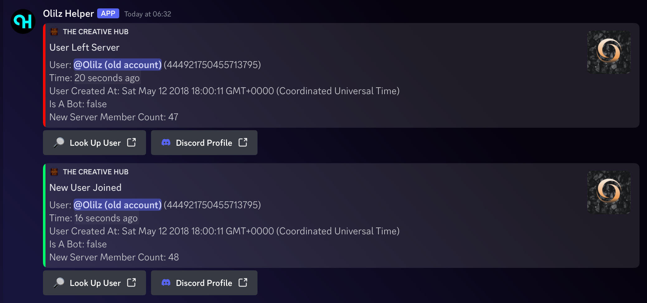 When a user joins or leaves your server, an embed is posted containing information about the user such as their username and account details.